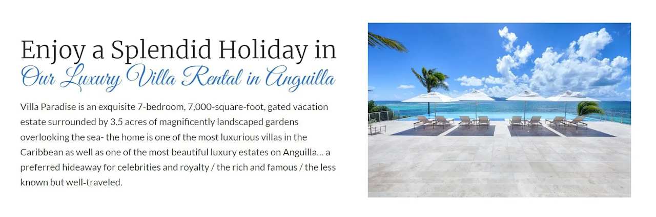 Villa Paradise is an exquisite 7-bedroom, 7,000-square-foot, gated vacation home surrounded by 3.5 acres of magnificently landscaped gardens overlooking the sea- the home is one of the most luxurious villas in the Caribbean as well as one of the most beautiful luxury homes on Anguilla a preferred hideaway for celebrities and royalty / the rich and famous / the less known but well‑travelled.